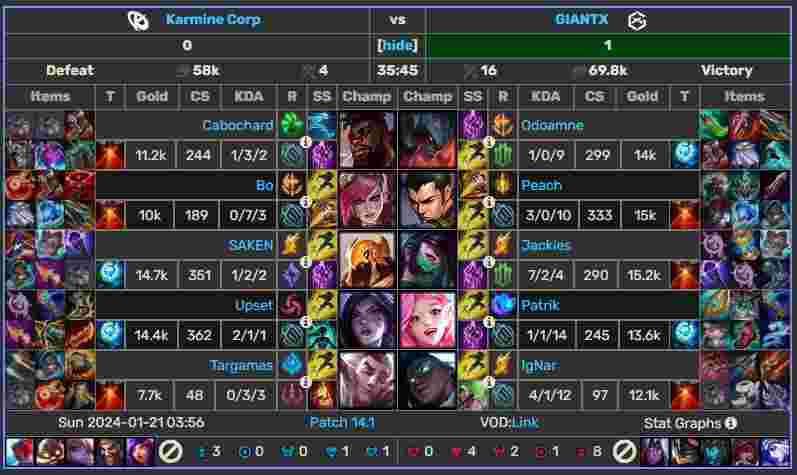 1月22日凌晨,2024LEC冬季赛第二周第二日的比赛,KC不敌VIT遭遇五连败,因假赛裹挟而被LPL永久禁赛的Bo使用莉莉娅打出3-5-7的全场数据。