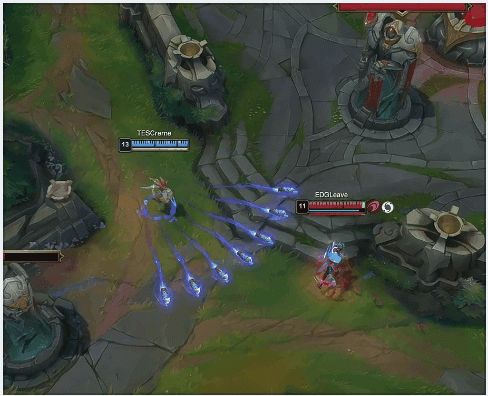 【0:53】EDG下路五人抓到卢锡安,卢锡安来到河道交闪逃生。
