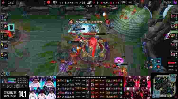 【17:13】TES下路放出先锋撞掉EDG二塔,经济优势来到9k。