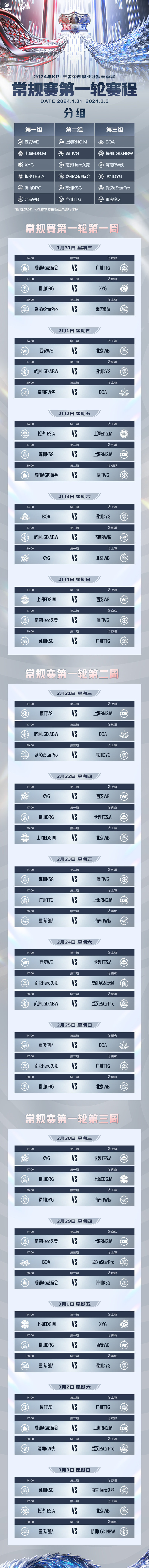 2024KPL春季赛赛程常规赛第一轮比赛时间为1月31日-3月3日,春节前一周,节后两周,共三周;本轮比赛为三组组内单循环,BO5赛制。
