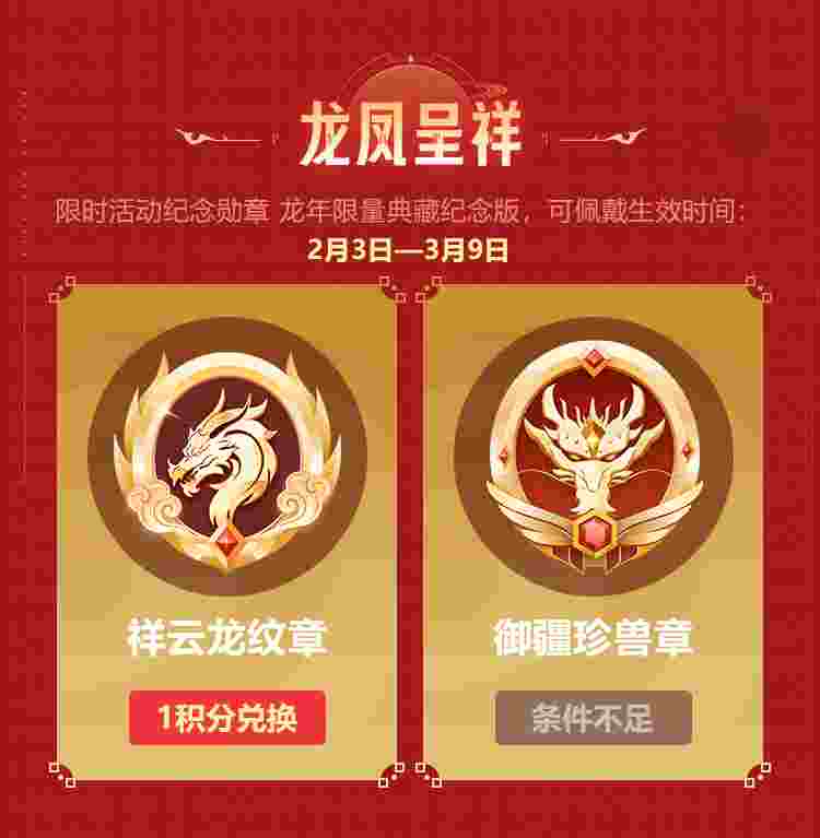 今年我们还推出了龙年限量典藏纪念勋章1积分购的限时活动,用户只需用1个APP积分即可兑换到1枚祥云龙纹章,回归用户还可额外兑换1枚御疆珍兽章。新年新勋章,快乐又安康~