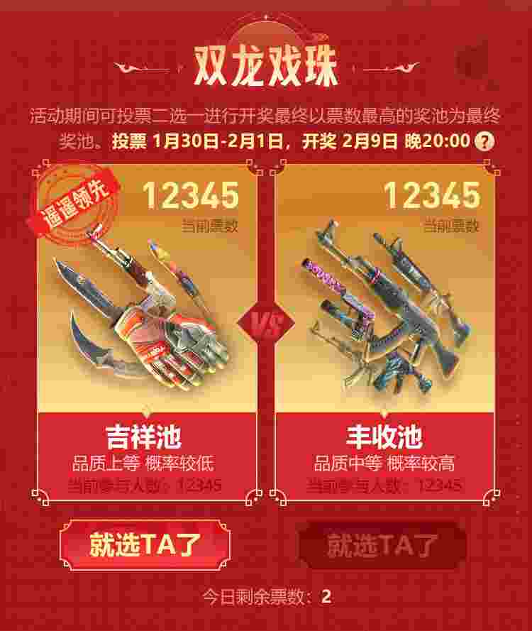 1月30日-2月1日,用户每日登陆5EPlayAPP即可获得1张投票券,回归用户可得2张投票券,用户可自行选择投给吉祥池/丰收池。结束投票后,得票多的奖池将会被选为最终开奖奖池。2月2日-2月9日用户需参与投票选出的奖池ROLL房,奖池将于2月9日20点准时开奖。新年ROLL一ROLL,好运滚滚来~
