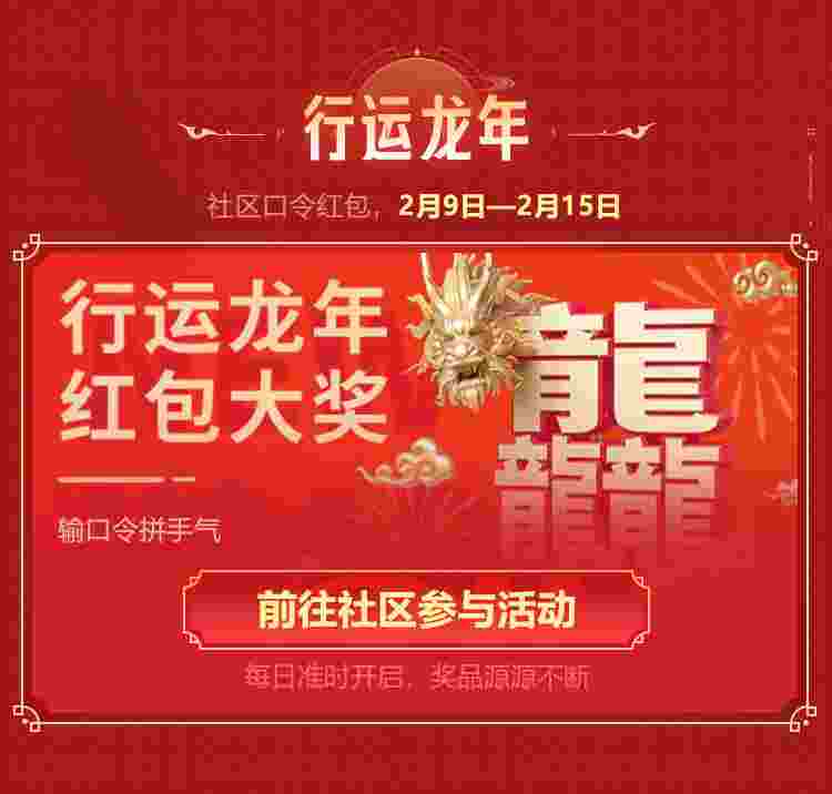 2月9日-2月15日期间,5EPlayAPP的社区帖子内将会公布红包口令,前往支付宝输入口令即可领取红包,每日的红包手气王还可额外获得军需奖励(武器箱和龙年印花各1份)。新年抢一抢,好彩自然来~