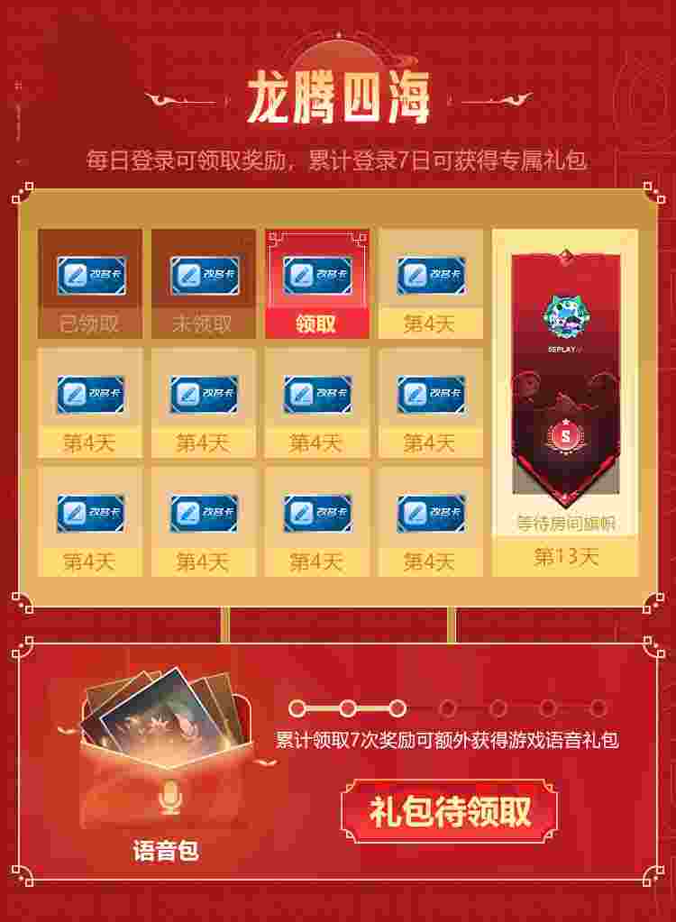 1月30日-2月15日期间,用户只需打开5EPlayAPP完成每日签到,即可领取每日好礼。累计完成7次签到,可额外领取游戏语音包一份!累计完成13次签到,即可领取龙年新春限定房间旗帜~新年签一签,福气常相伴~(实际奖励以活动页面为准)