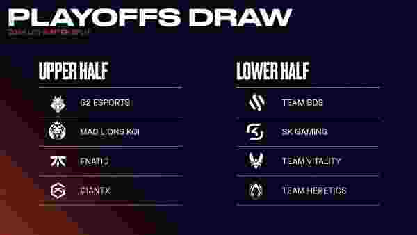在常规赛结束后的抽签中,G2、FNC、GX和MDK抽到了上半区,BDS、SK、VIT和TH则是抽到了下半区