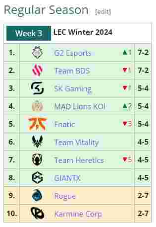 1月30日凌晨,2024LEC冬季赛的常规赛迎来收官日,KC水鬼附体掀翻榜首BDS帮助G2拿到常规赛第一: