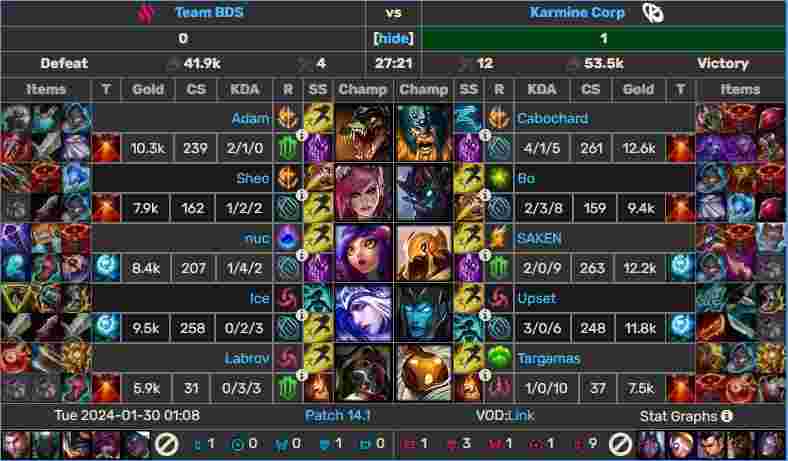 最后一天的比赛KC全队爆种,下路Upset和Targamas一反常态对线期完全压制住了BDS的下路组合,上中的Cabochard和Saken对位上也不落下风,Bo选出功能性打野大树轻松帮助KC滚起雪球顺利战胜BDS。