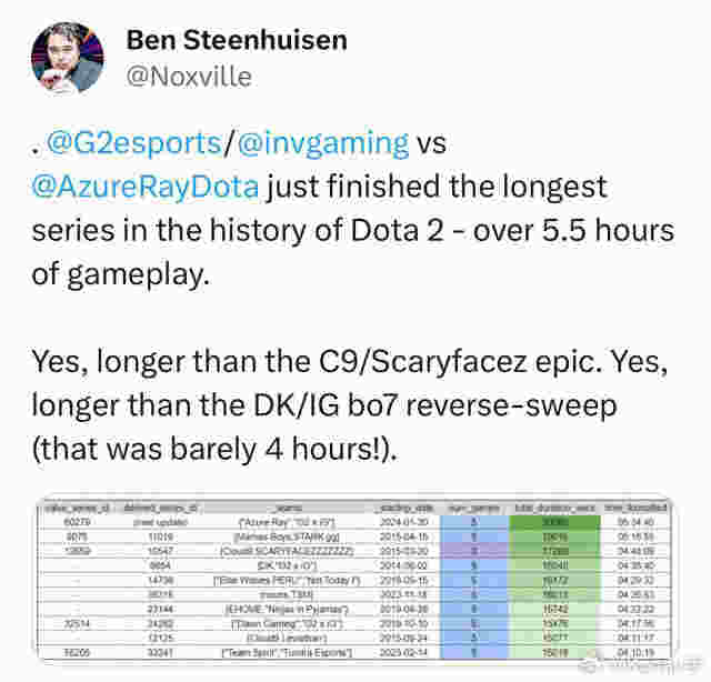 ESL One伯明翰站中国区预选赛总决赛上,AR对阵G2.iG的BO5打破了纪录。凭借5小时34分钟的总时长成为dota2历史上时长最长的一个系列赛!时长甚至超过了DK让三追四战胜IG的那轮BO7!AR战队更是从败者组决赛开始,连续打了整整十二个小时的比赛(算上BP和场间休息)。