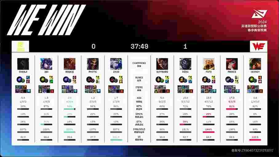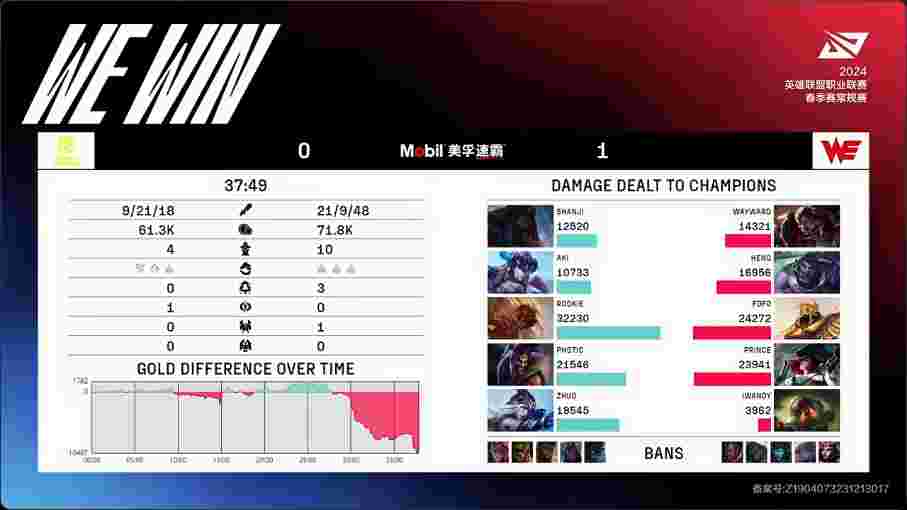 第37分钟,双方在中路再次爆发团战,泰坦极限一勾命中德莱文,女枪大招瞬间秒杀,WE轻松完成0换5后一波结束了比赛。