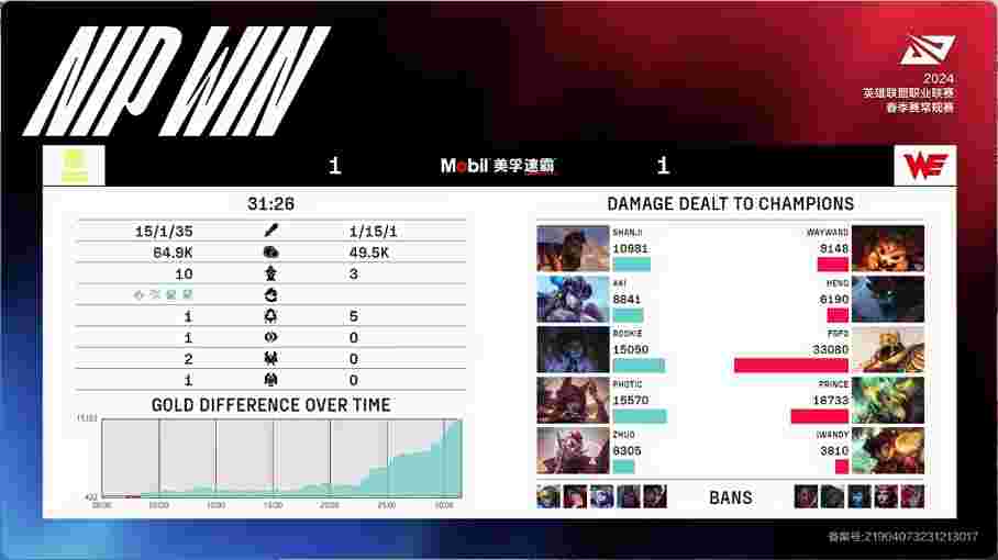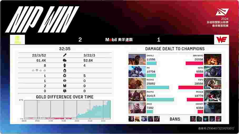 第31分钟,双方爆发大龙团战,NIP率先拿下大龙,大树被岩雀从侧面poke击杀,随后NIP追击轻松击杀WE中野后中路一波结束了比赛。