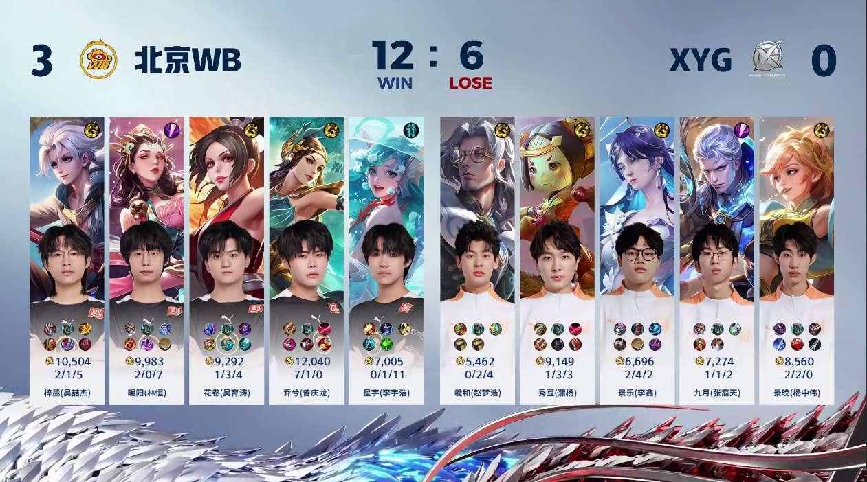 十二分半,双方经济差来到8K,XYG只剩三高。十四分钟,北京WB稳稳控下暗影主宰,并凭借龙兵进到水晶,乔兮(曾庆龙)虞姬伤害爆炸拿到四连超凡,北京WB顺势一波,获得本场比赛的胜利。