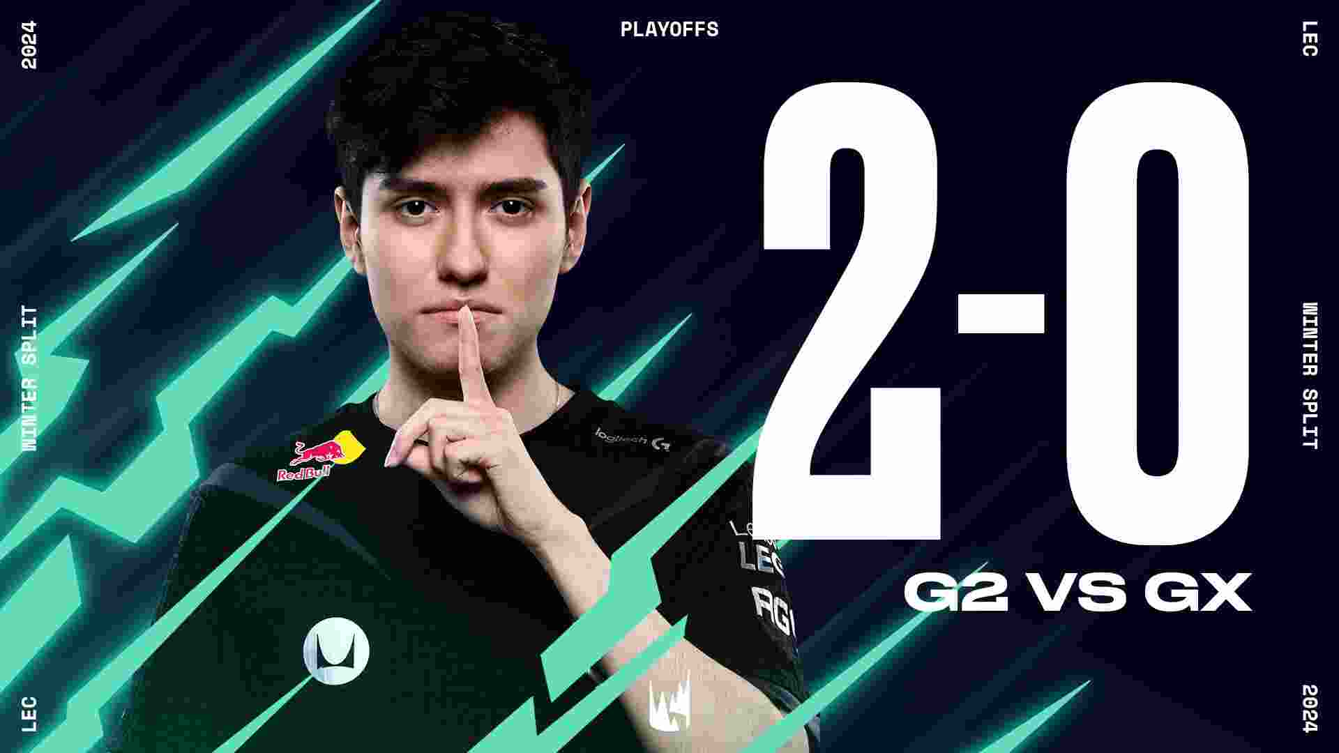 G2对阵GX的比赛中,第一场GX前期处于优势和G2有来有回,但是在大龙坑的一波交战中,GX在打野赵信的带领下发起少打多,被领先TP的Brokenblade完成支援,G2最终在Caps超神的慧的带领下终结比赛。