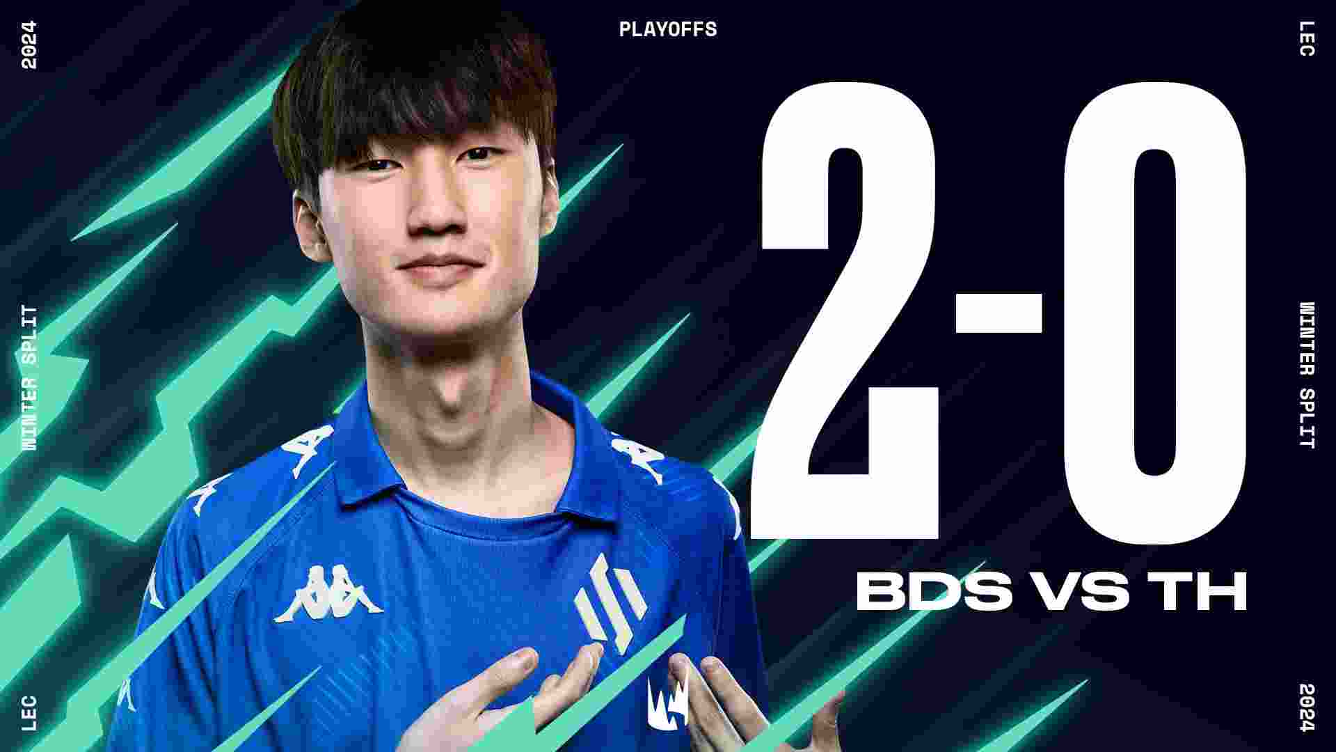 第二场TH在Jankos薇的活跃下前期和BDS有来有回,但在25分钟TH试图依靠BDS回家的空档期偷掉大龙,被BDS的波比发现,完成了抢龙,随后的团战呈现出一边倒的局面,三件套发育成型的维鲁斯迅速终结比赛。