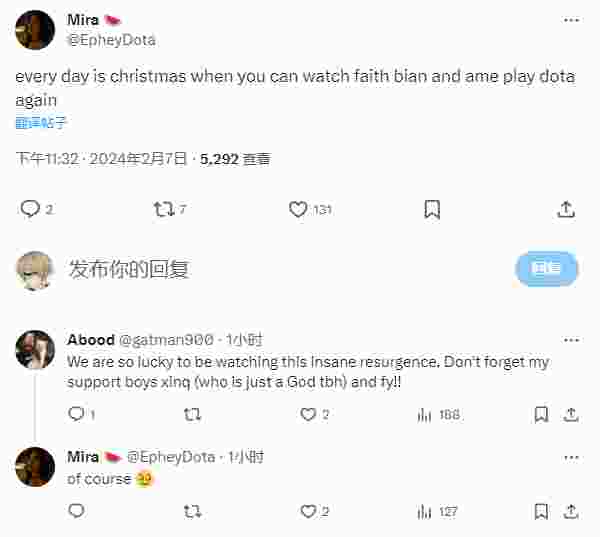 在刚刚结束的BB别墅杯2月8日赛程中,国外知名女解说Ephey(约旦妹)在推特上发表动态:当你能再次看到faith bian和ame的比赛,好似每天都是圣诞节。