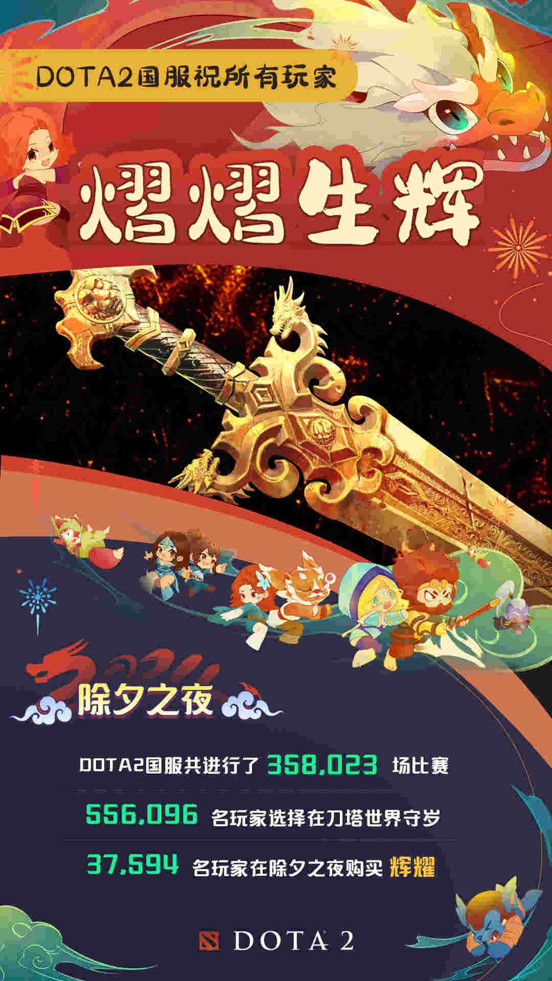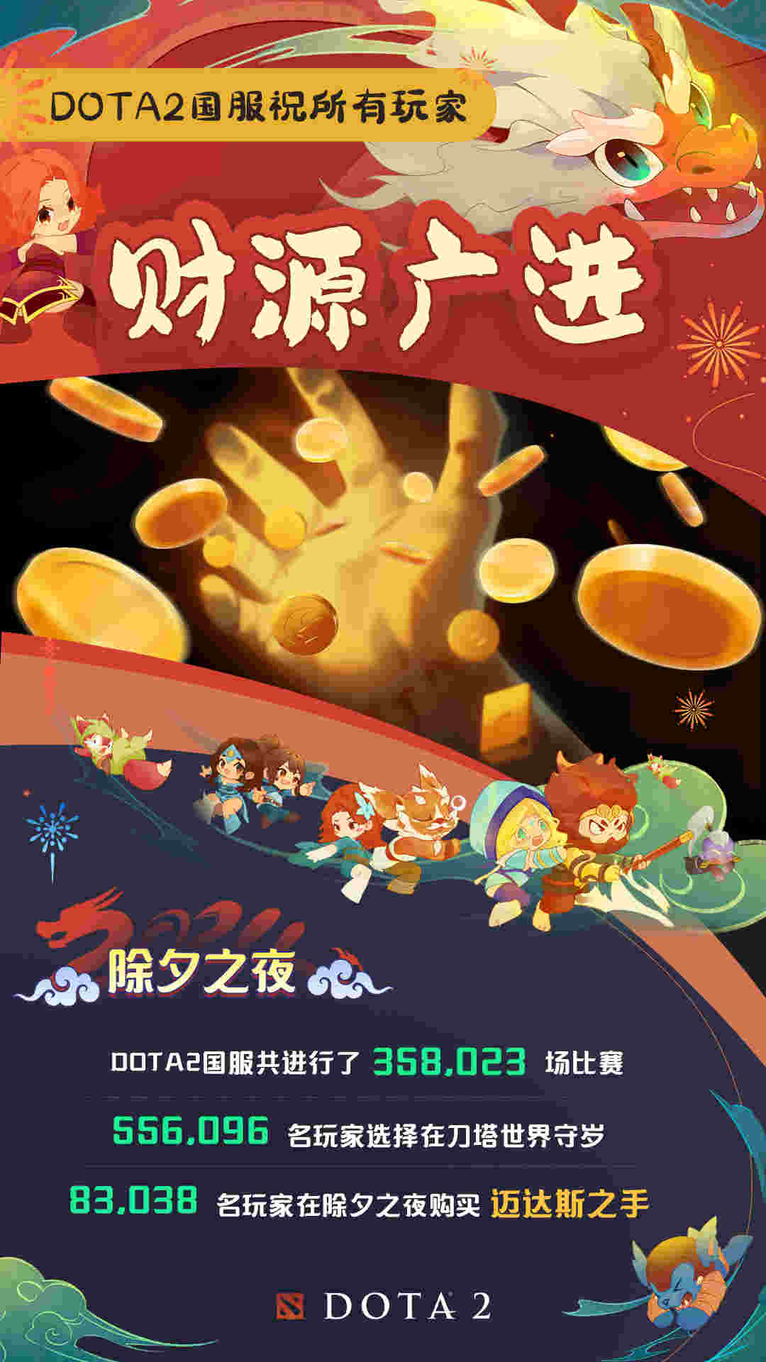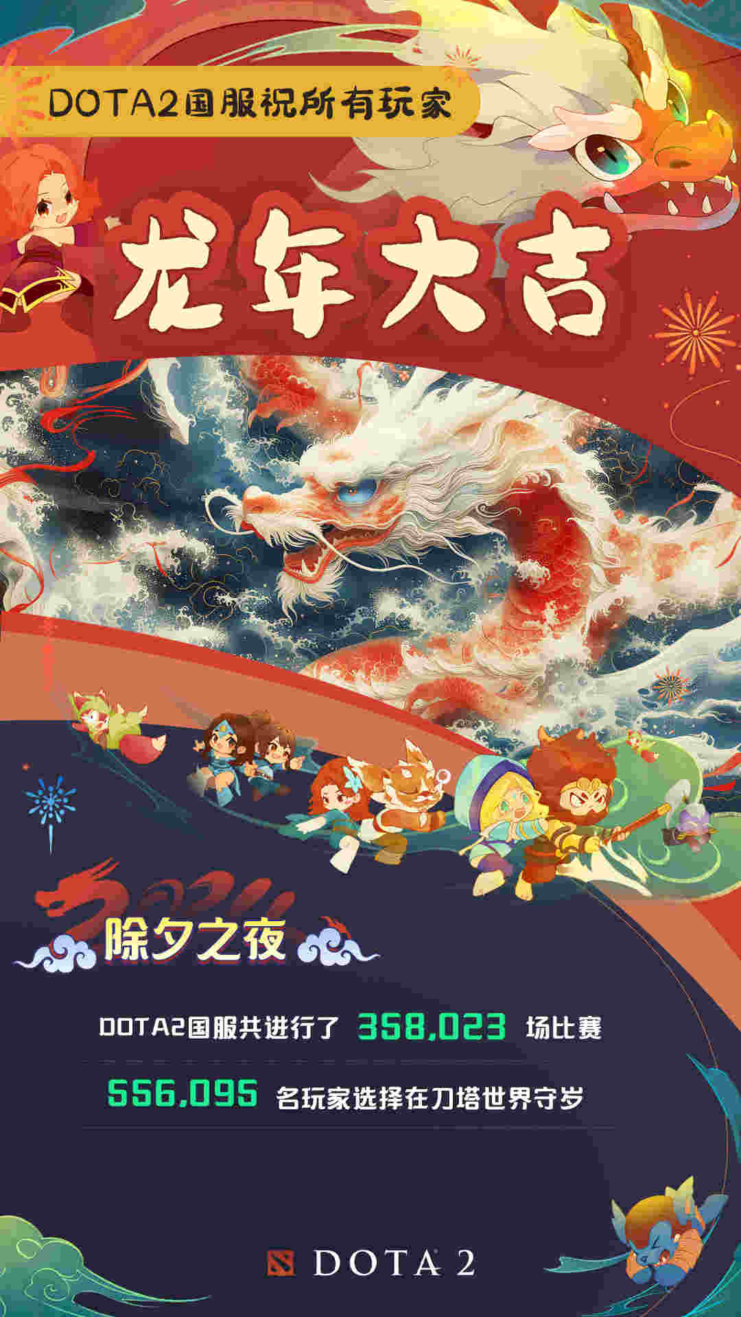 近日,DOTA2官方发布了一项趣味数据:除夕夜DOTA2国服发生了358023场比赛,有556095位玩家在刀塔世界守岁!具体内容如下: