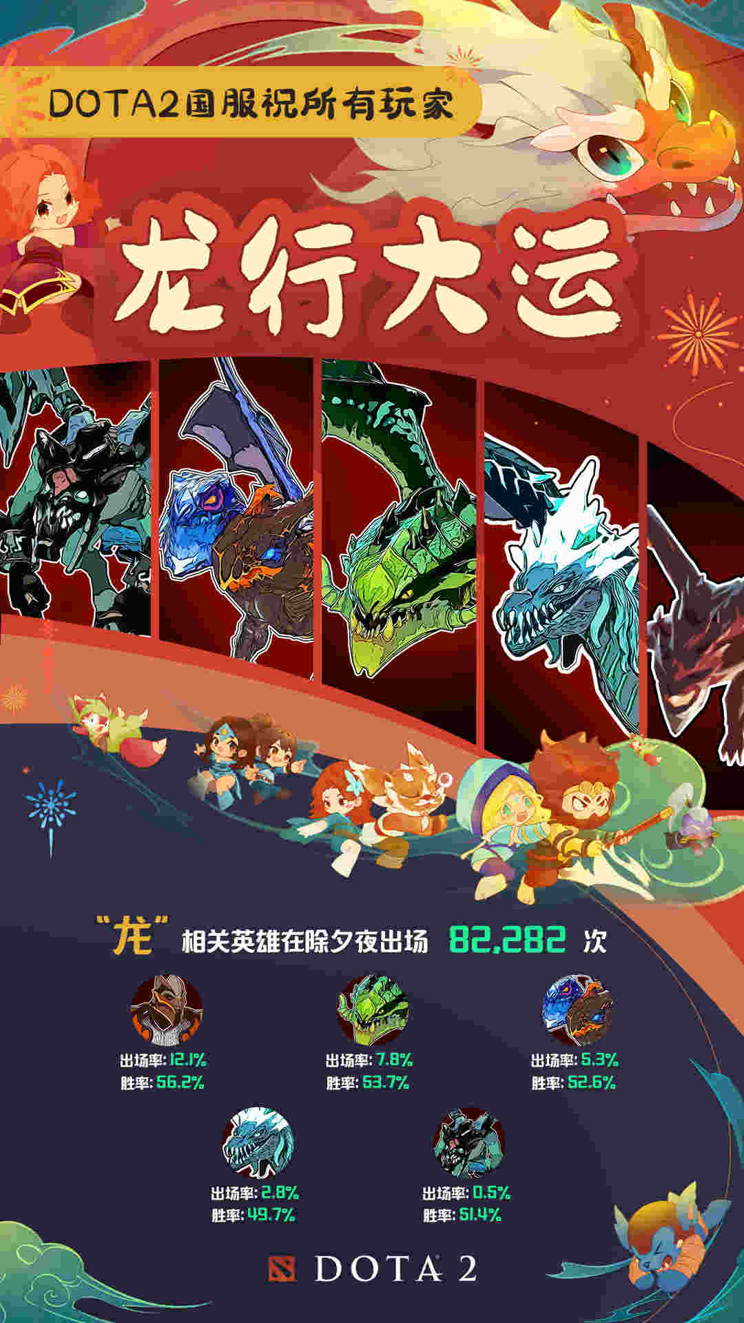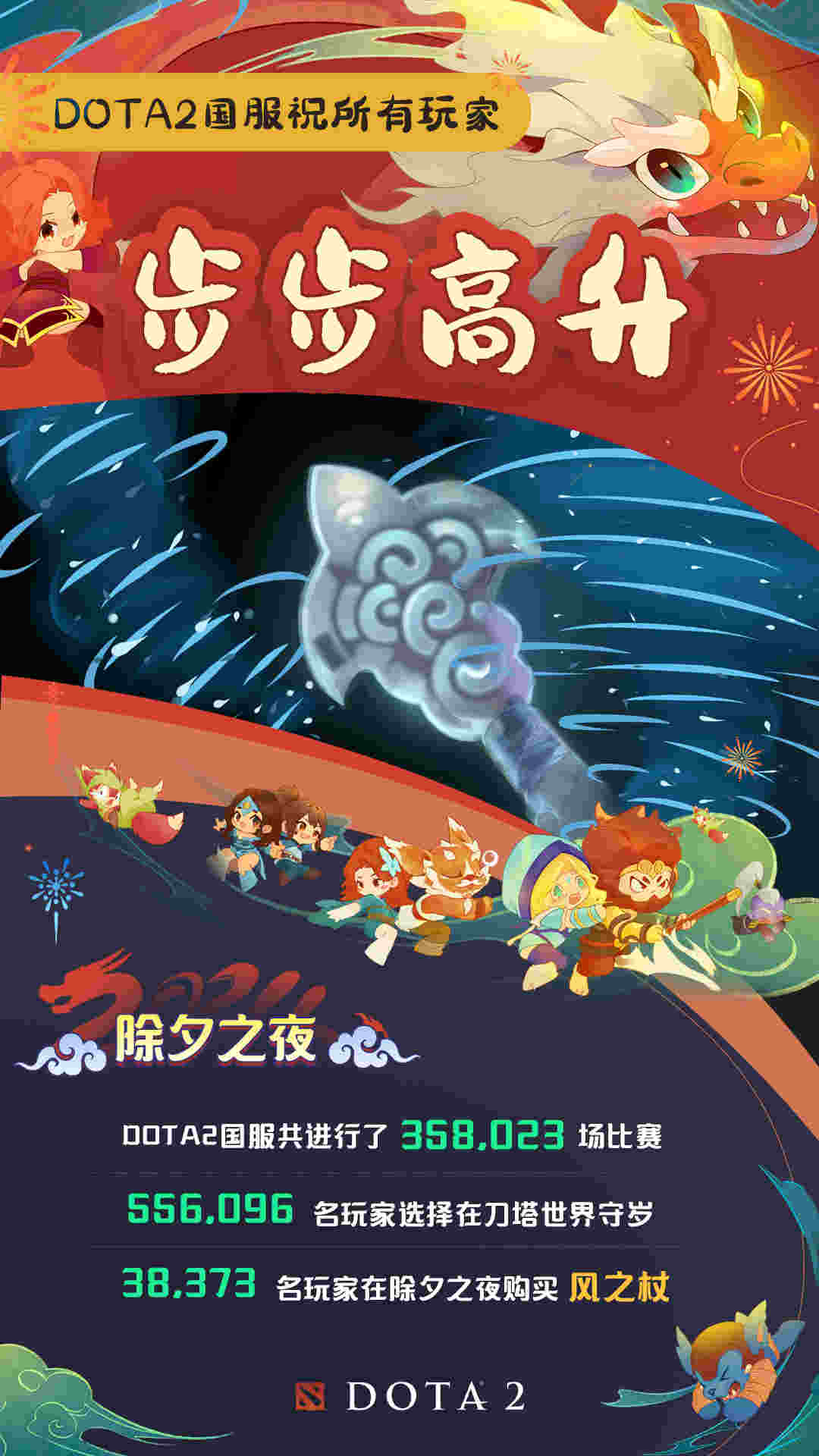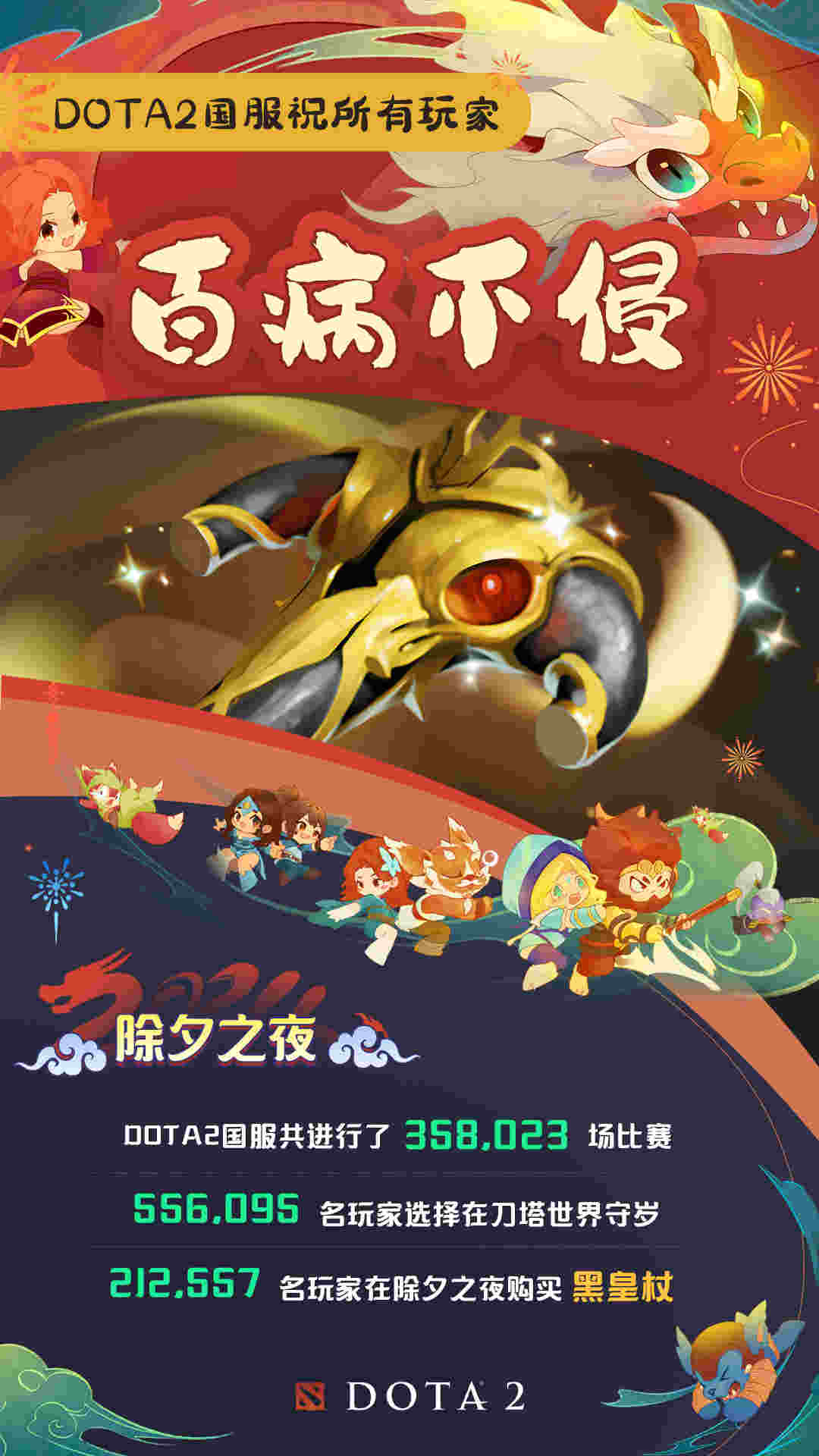 近日,DOTA2官方发布了一项趣味数据:除夕夜DOTA2国服发生了358023场比赛,有556095位玩家在刀塔世界守岁!具体内容如下: