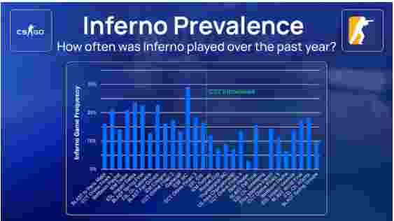 在CS:GO的最后阶段,Inferno在IESF世界锦标赛上的使用次数最多,24场比赛中出现了七次(29.2%)。而在ESL挑战赛卡托维兹2023上选择次数最少,在23场比赛中仅被选了三次(13.0%)。这些是比赛场次相对较少的赛事,但如果我们只考虑50场以上的赛事,我们会发现Inferno出现最少的是BB Playlist Freedom(14.17%),而最多的是BLAST秋季小组赛2023(22.8%)。