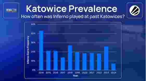 在EMS One卡托维兹2014比赛中,选择Inferno的比例达到了历史最高点,43.2%。尽管2014年是个特例,Inferno在波兰比赛中的出场比例仍然保持在22.0%,即使在赛事形式发生变化(增加了更多比赛),甚至在2019年Major之后也是如此。2024年是否会成为一个特例年,就像2014年一样但方向相反,还是持续这个趋势,尚有待观察。