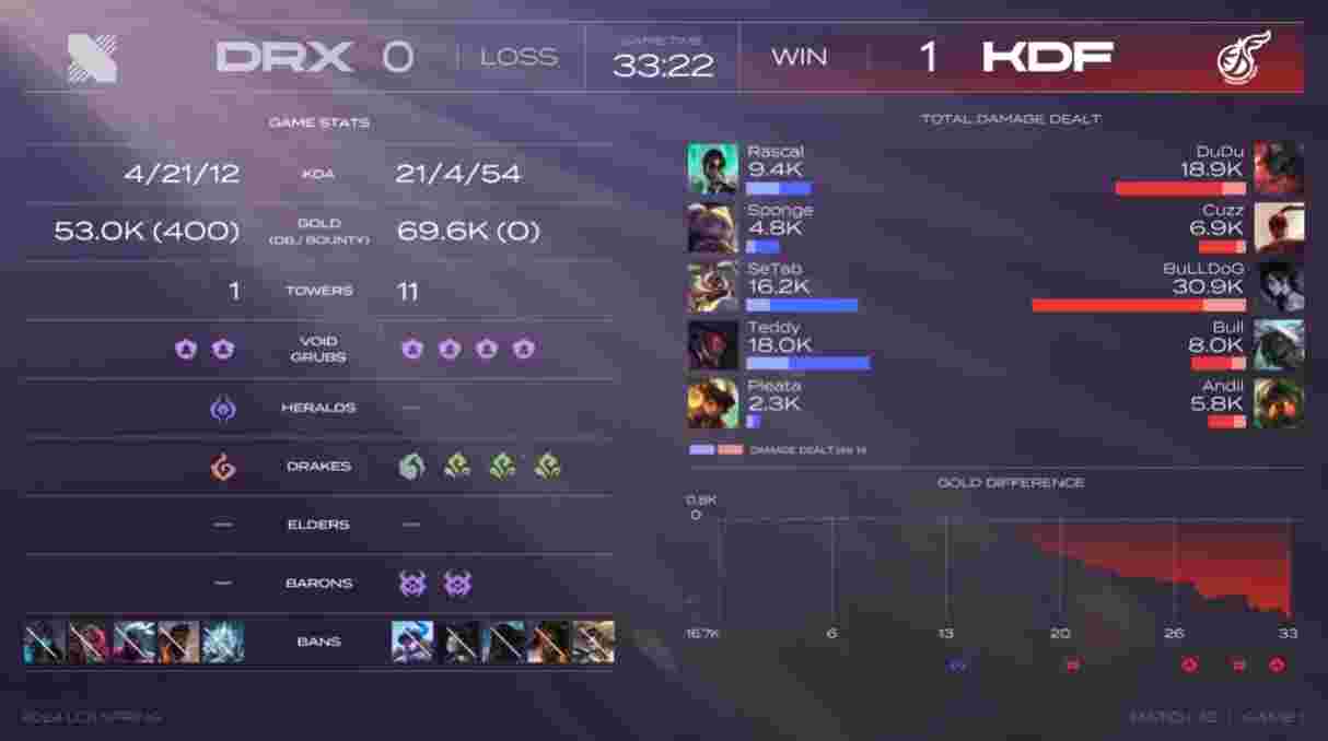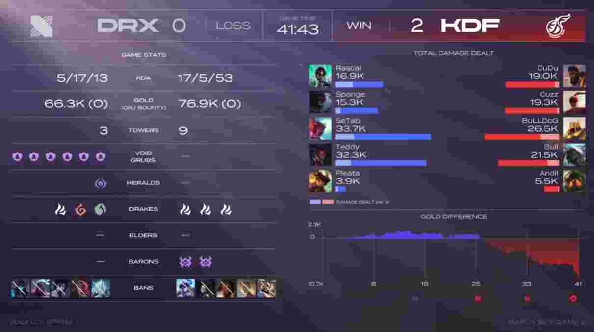 【27分钟】DRX抱团在河道抓机会失败,DuDu剑魔帮助KDF瞬间打出一波1换5团灭DRX。经济差距拉开到1w3。