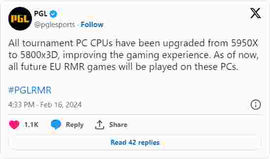PGL宣布对欧洲RMR锦标赛的计算机CPU进行了更换,将2020年就推出的AMD Ryzen 5950X换成了较新的2022年的5800x3D。在GPU方面,计算机仍将采用Nvidia RTX 4080 16GB显卡。