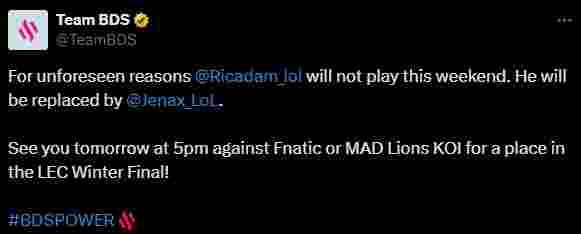 2月16日,LEC赛区BDS战队发布公告称,先发上单Adam因意外原因将缺席周末的比赛: