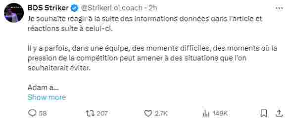 2月18日凌晨,BDS在2024LEC冬季赛败决不敌MDK无缘决赛,赛后外媒爆料BDS首发上单Adam因辱骂教练和队友等一系列不端行为遭到团队雪藏,之后Adam也在个人社媒现身回应了这一传闻否认了部分指控,BDS教练Striker也站出来为Adam发声: