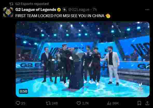 2月19日,2024LEC冬季赛决赛上,G2以3比1战胜MDK夺得冠军,同时成为全球第一支锁定2024成都MSI的队伍,赛后G2官推发文: