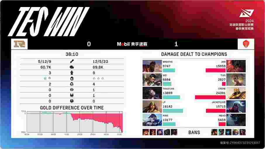 第16分钟,RNG中野辅越塔上路,但被剑魔开出大招打满伤害率先击杀发条,成功触发回血,剩下两人缺乏足够伤害,艾希也被留住击杀。