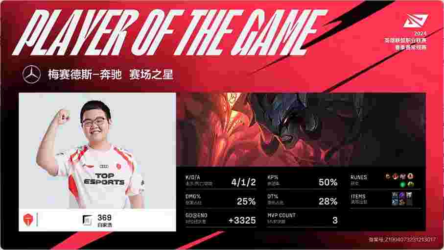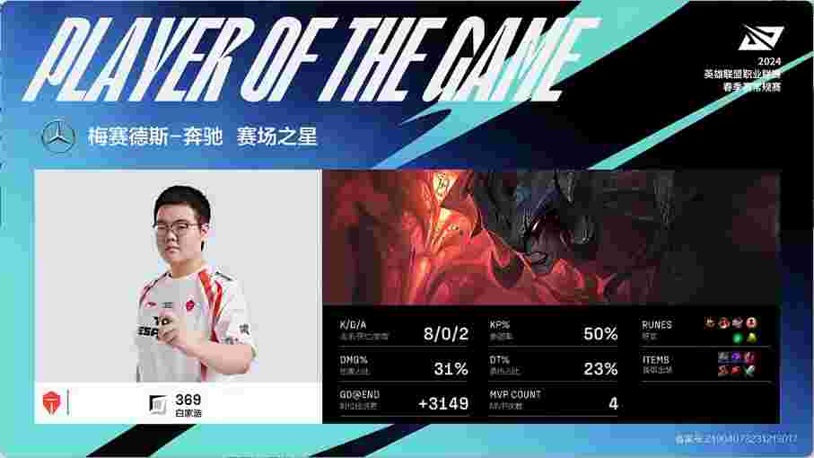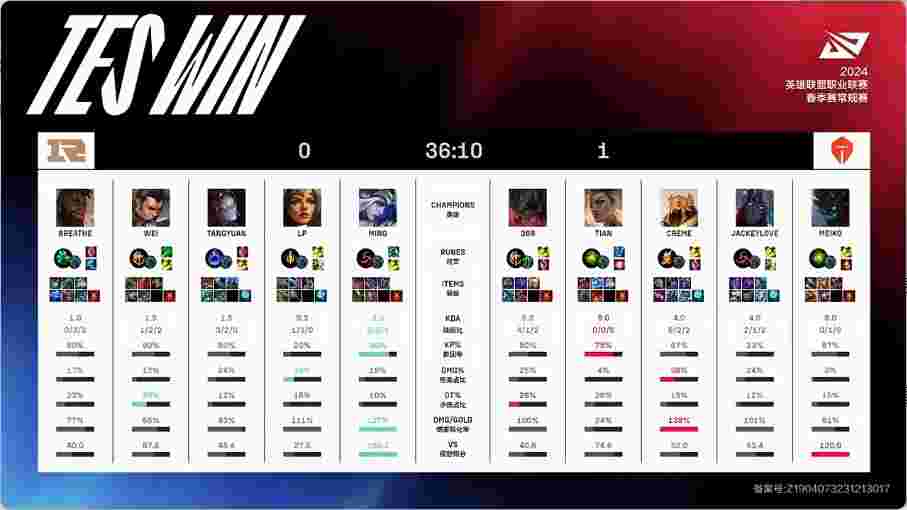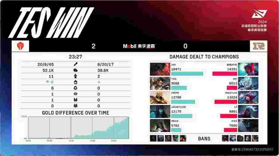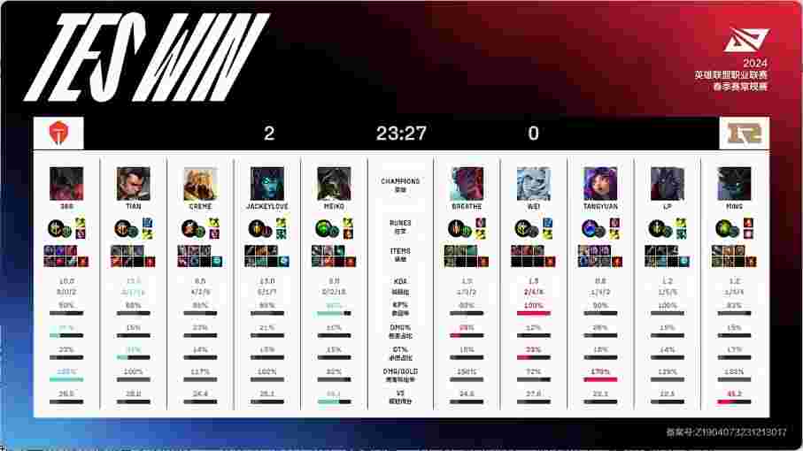 第35分钟,艾希在中路找到机会大招命中维鲁斯配合奎桑提成功秒掉,但此时TES中上双核发育完全轻松打出0换4在推基地时成功团灭对手一波结束了比赛。