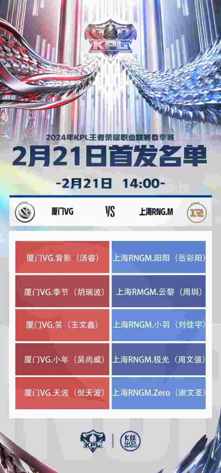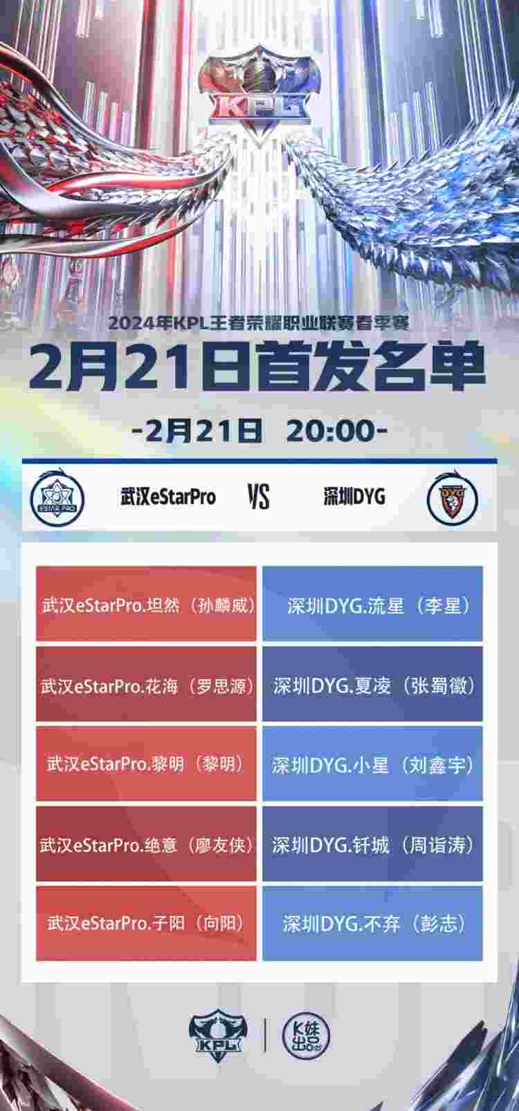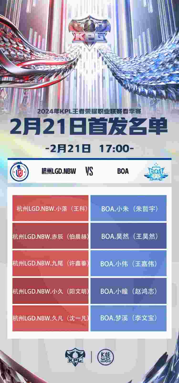 2月21日,KPL王者荣耀职业联赛官博发布了2024KPL春季赛常规赛第一轮W2D1的首发名单,具体如下: