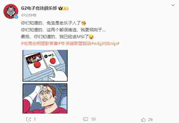 G2电子竞技俱乐部官博发文整活,原文如下:你们知道的,兔宝是老乐子人了,你们知道的,这两个都很难选,我更倾向于…最后,你们知道的,我已经进MSI了。
