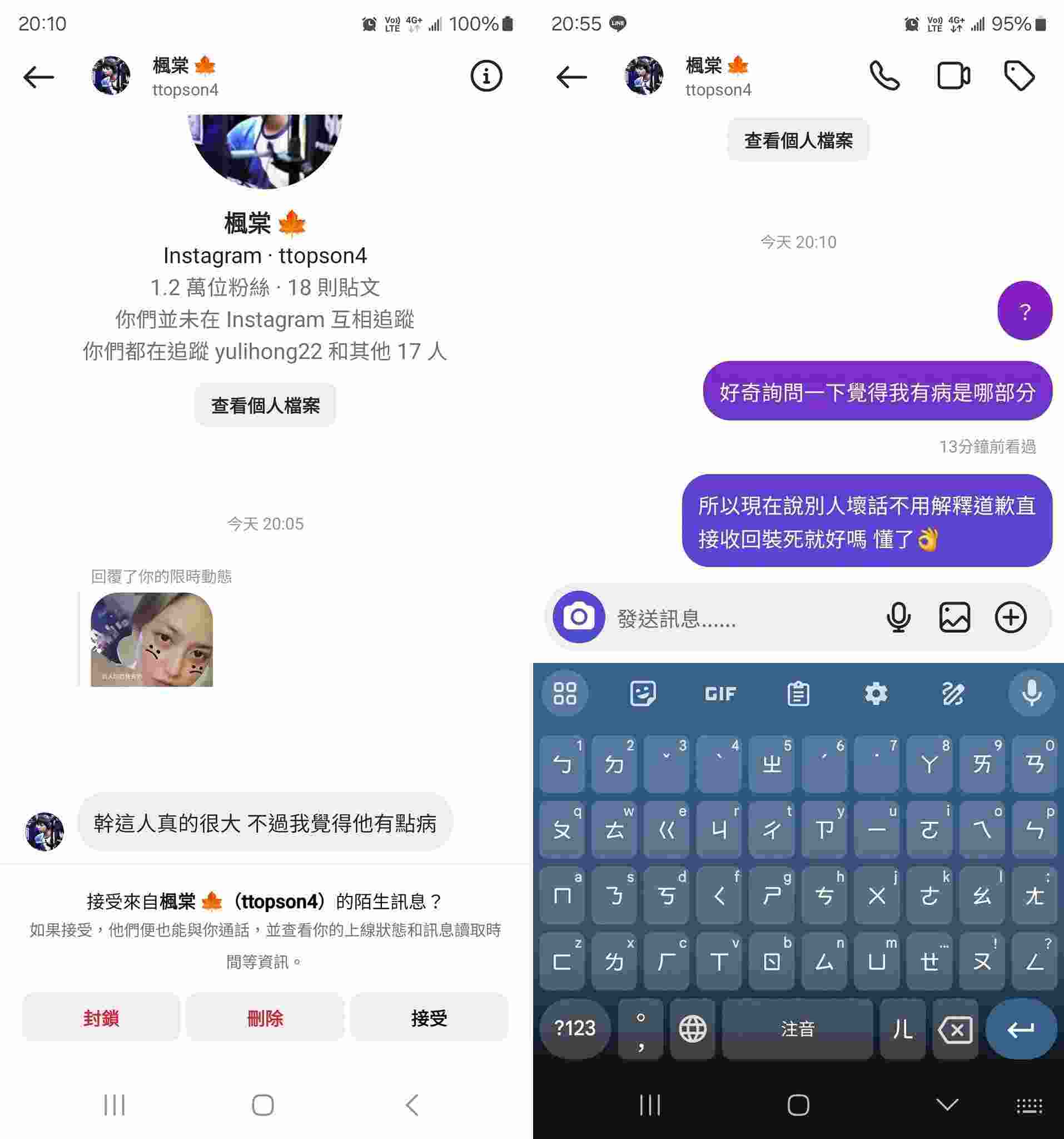 这名女网红22日在FaceBook上公布对话截图,只见Maple回复她在Instagram的一张限时动态,并评论“这人真的很大,不过我觉得她有点病”,但不小心发给了该名网红本人
