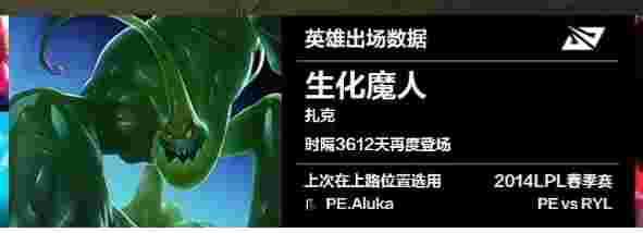 这也是上单扎克时隔3612天再次登场,上一次出场由PE正能量的Aluka(阿鲁卡)使用