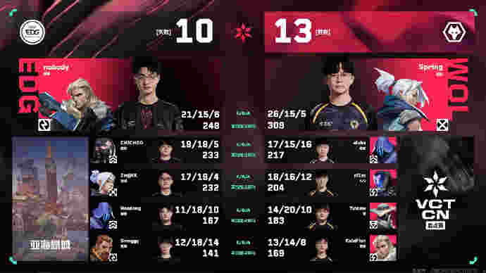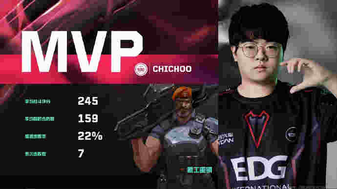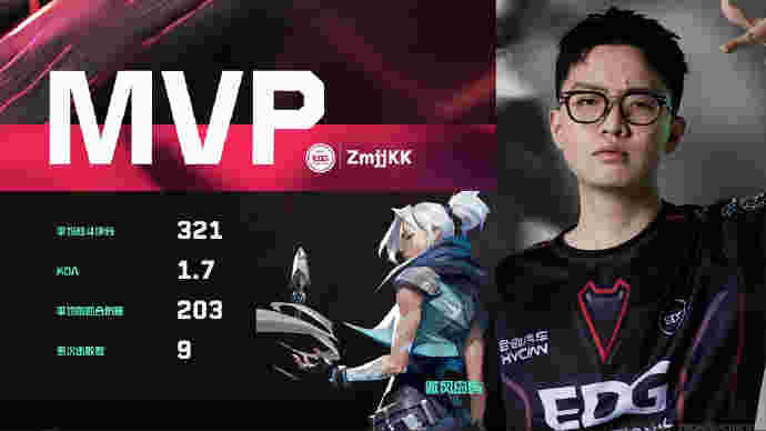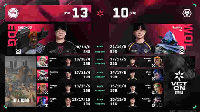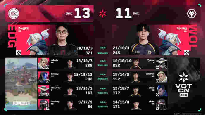 下半场开始,WOL在aluba的三杀下赢得了手枪局,并利用经济优势再拿一分。随后进入福利局,EDG完成反清重新打开了得分窗口,并在CHICHOO和nobody连续三杀下稳住了局势,进一步帮助EDG将比分反超。到了第二十二回合,EDG在CHICHOO的三杀下率先拿到了赛点,但下一回合却被Spring的五杀直接逼出了暂停。暂停之后,EDG在ZmjjKK和CHICHOO的双人残局下赢得了比赛的胜利,本场比赛的MVP给到了ZmjjKK。