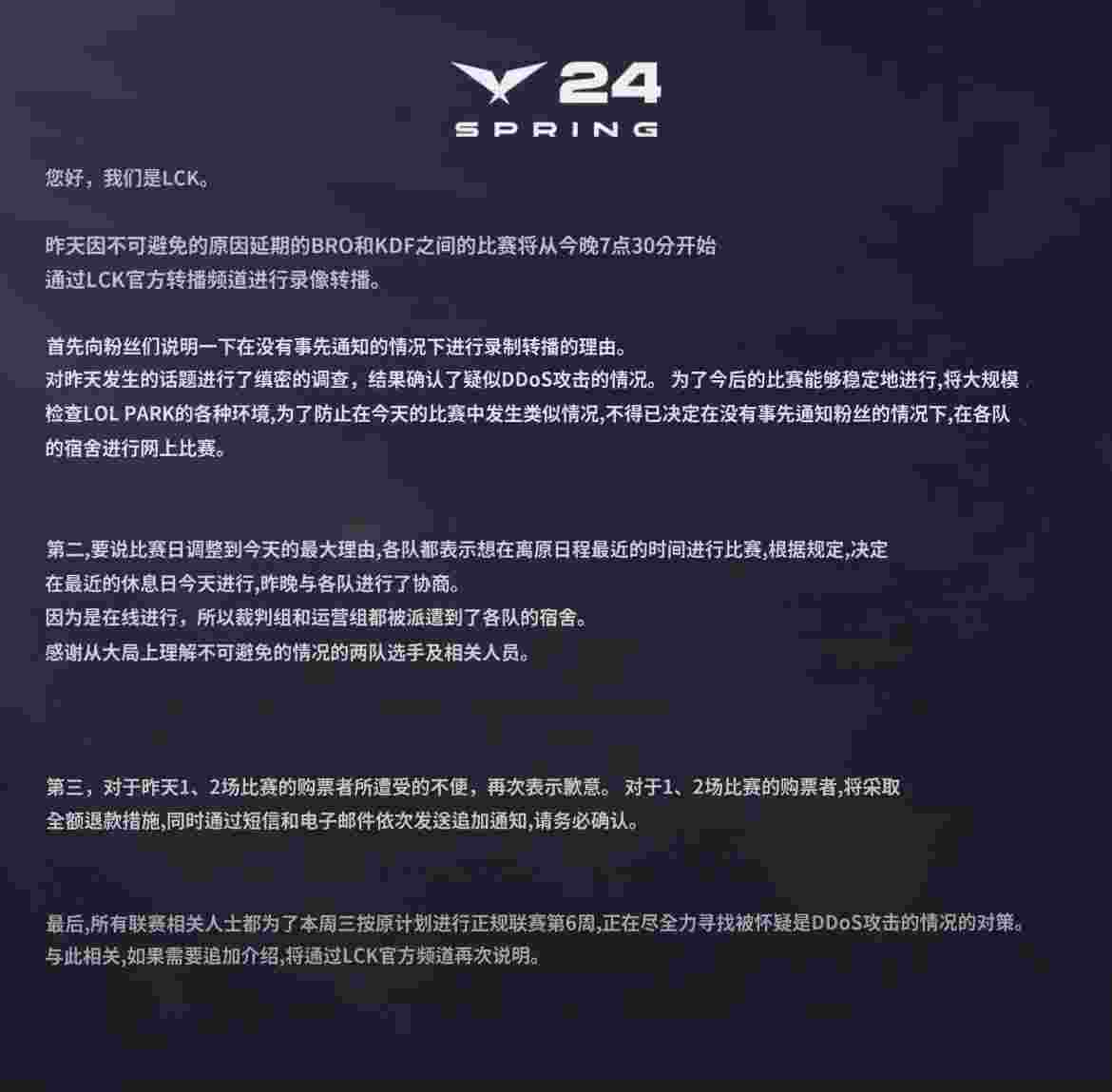 2月26日,LCK官方针对昨天出现的长时间比赛暂停发布公告: 昨天因不可抗力影响延期的BRO和KDF的比赛将于今天7点30分(KST)通过LCK官方频道进行录像转播。