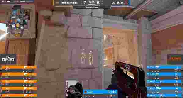 图二为JJH选择的Anubis,先作进攻方的他们率先赢下手枪局和eco局,第三局,ISSAA率先掉点,随后JJH一波抱团攻打B区,B包点的day0s拿下三杀,Twisted Minds得到第一分。没能攒上钱的JJH下一局只能强起,显然无法打过装备更加精良的Twisted Minds,Twisted Minds顺势反超比分。随后的长枪局JJH虽然成功下包,但却没能守住包,比分被Twisted Minds逐渐扩大至7-2。第十局,双方在A大二换二,之后控图E1lan在B大外击杀两名中路前顶CT,JJH拿到人数优势,顺势得到第三分。这分过后JJH找回了一些状态,上半场结束Twisted Minds以7-5暂时领先。