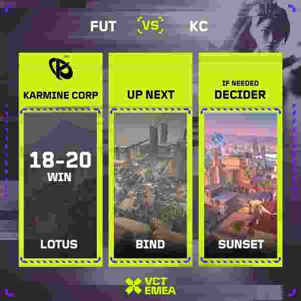 而Karmine Corp则在他们的第二次手枪局败北后将自己置于了一个不进则退的困境中。结果证明他们在上半场挖的坑太大了,最终FUT成功拿下自己的选图将比赛拖入图三。
