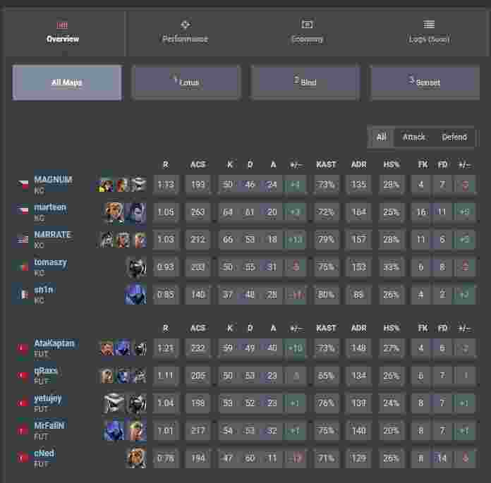 来到图三日落之城,双方的阵容几乎是彼此的镜像,唯一的区别是KC上的盖克和FUT上的黑梦。KC在上半场赢得了手枪局,并在防守端取得了领先,sh1n及时的封烟和N4RRATE的lineup为队伍取得了很多回合的胜利。KC上半场以10-2的巨大优势领先,FUT需要近乎完美的防守来避免落入被淘汰的结局。FUT赢得了第二次手枪局,完成了他们反击的第一步,接着是奖励局的轻松取胜。尽管土耳其纵队希望在下半场保持连续拿分的势头,但他们在开局的连续掉人导致11-6的比分落后。Magnum和marteen延续了他们在上半场的优异表现,帮助KC在图三中以13-7的比分结束比赛,并以2-1的比分赢得系列赛。