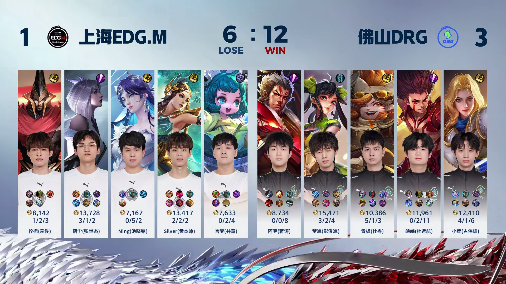 10分半,双方暴君坑爆发团战,上海EDG.M一波一换二,控下第一条暗影暴君。12分半河道,佛山DRG_阿豆 (蒋涛)张飞大招关键控住四人,配合佛山DRG青枫 (杜舟)沈梦溪大招打出爆炸伤害,佛山DRG零换三,掌控全场视野,收割野区资源。17分50秒,野区阿豆 (蒋涛)张飞反手极限开出大招,佛山DRG全员追击,现行带走两人,推掉全部高地后,带着龙兵减员对方四人,直接击破水晶,拿到本场胜利!