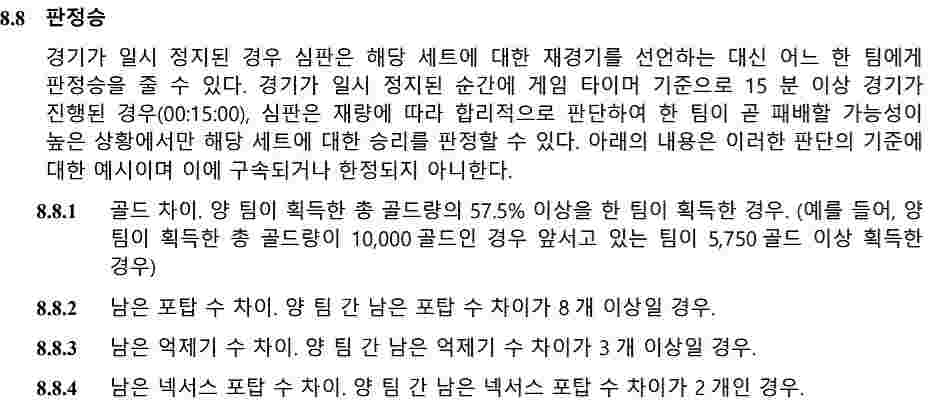 如果比赛暂停,裁判可以宣布该局重赛或者判给队伍其中一方获胜。在比赛暂停的瞬间,以游戏计时器为基准进行15分钟以上时,裁判根据合理判断,只有在一队很有可能即将失败的情况下,才能判定该局的胜利。以下内容是对这种判断标准的示例,并不受此约束或限定。