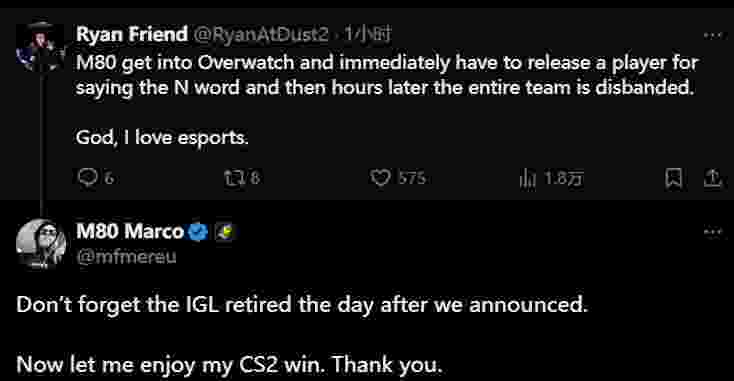 而M80创始人兼CEO在推特中表示:别忘了我们宣布之后的第二天,指挥就退役了。