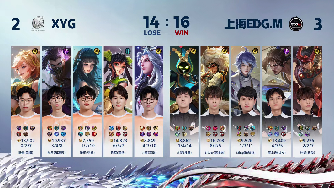 十四分钟,XYG只剩中高,上海EDG.M再控下暗影主宰。十五分四十上海EDG.M试图抱团压高,但XYG背靠水晶输出,秀豆(蒲杨)孙尚香装备成型伤害颇高,拿到二连击破,XYG零换四将仅存的成吉思汗逼退。十七分半,上海EDG.M从中路突破,Silver (黄本帅)成吉思汗站桩无敌输出,四连超凡团灭XYG,拿到最终胜利。