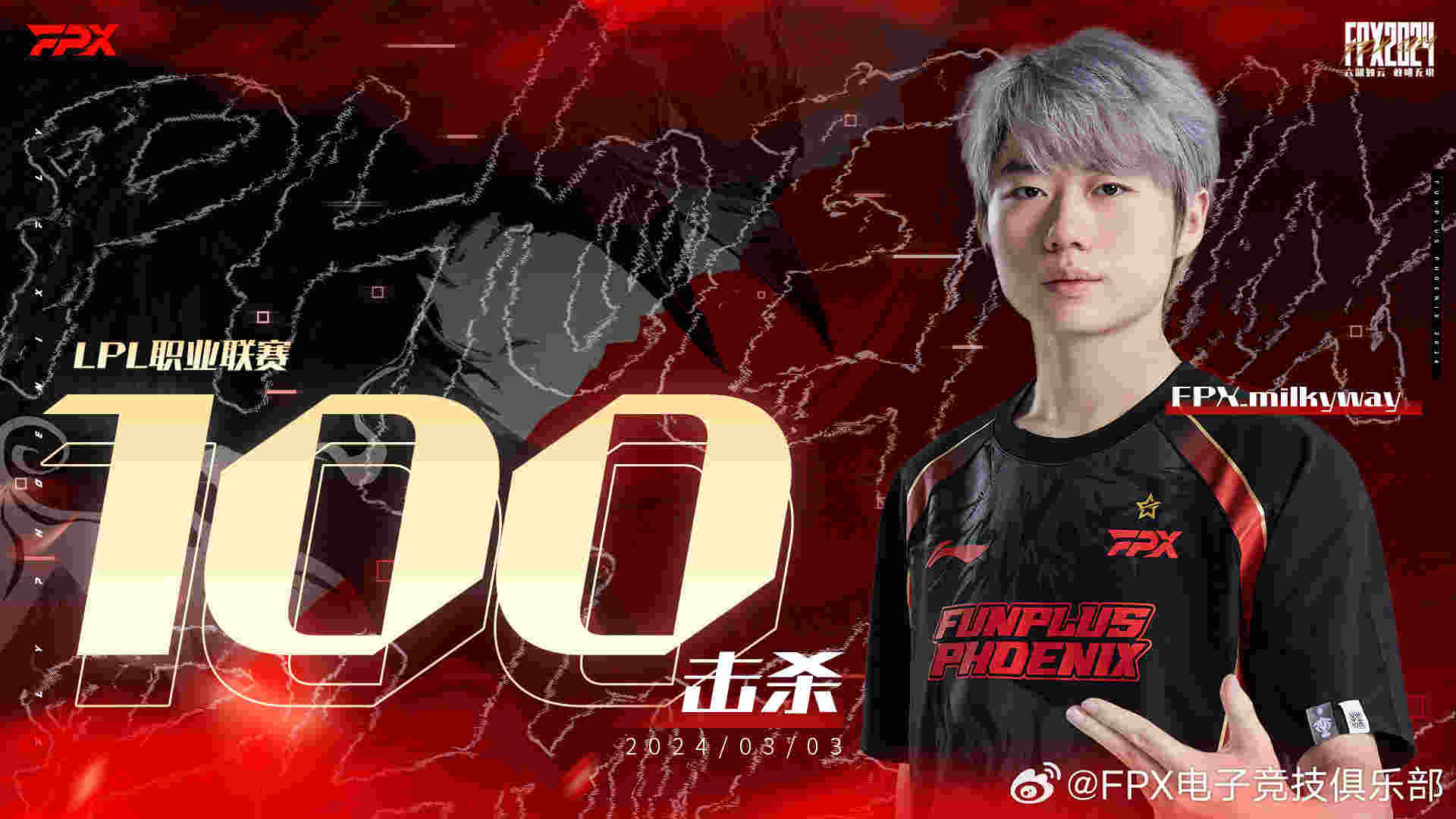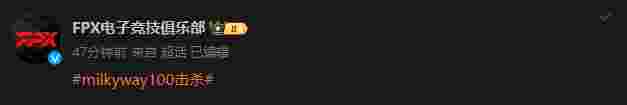 3月3日,2024LPL春季赛常规赛,FPX以2比0横扫WBG,Milkyway在第二局比赛中达成了2024LPL春季赛100杀,是首个达成此记录的打野选手: