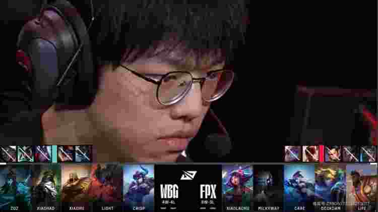 【19:28】妮蔻下路守塔被WBG三人联手绞杀,沙皇带掉FPX下路一塔,双方经济持平。