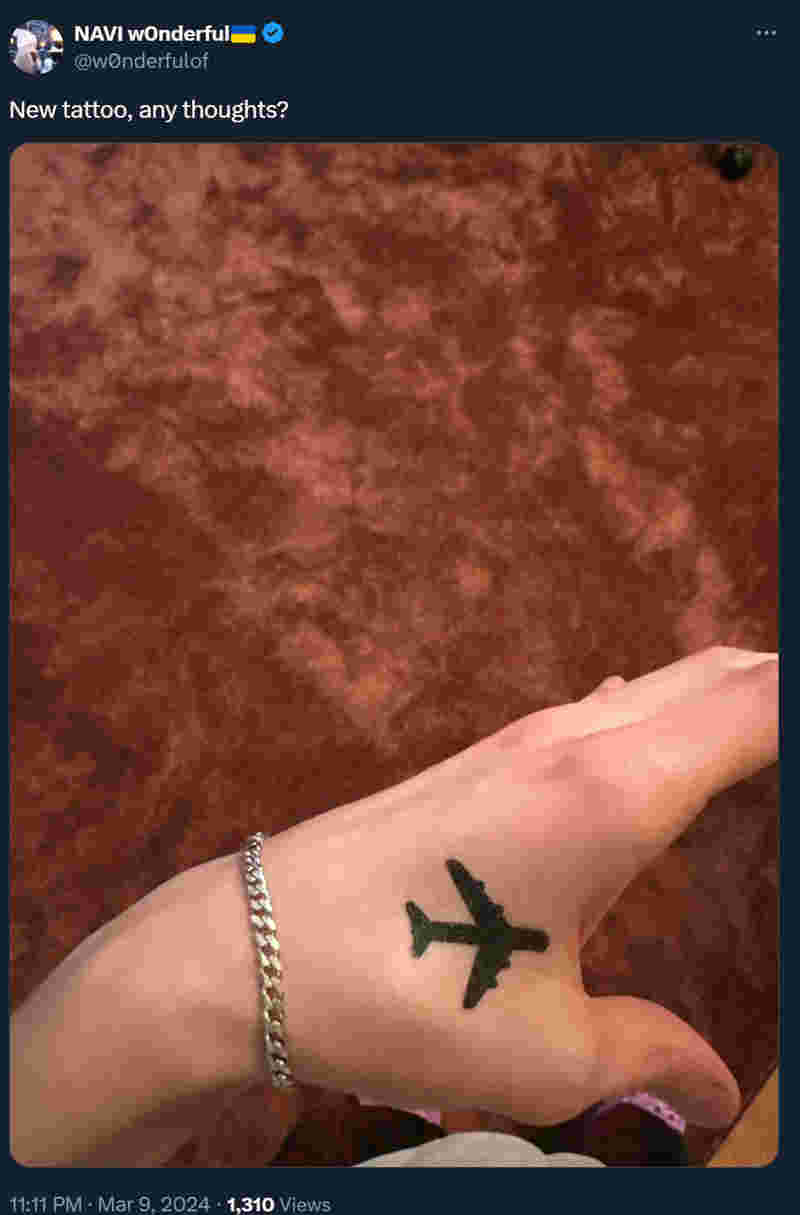w0nderful的这个纹身很显然和s1mple有着密切的关系,因为s1mple在左手也有一个同样的飞机纹身。s1mple曾在一则采访中对这个纹身有过解释,他希望通过飞机这一象征性的符号,来表达自己对于自由和旅行的向往,他希望自己职业生涯能去多个国家和地区比赛。