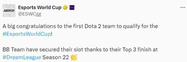 利雅得大师赛主办方在官推上发布内容,BB战队成为DOTA2项目中第一个获得参赛资格的队伍,因为他们在梦幻联赛上拿到了前三的战绩,利雅得大师赛一共有八名队伍会获得直邀。共二十支队伍参赛,八支直邀战队和十二支地区预选赛的战队。