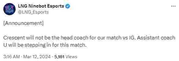 3月12日凌晨,LNG俱乐部在推特的官方账号发布公告,表示Crescent(白色月牙)在对阵IG的比赛中不会作为主教练出场:
