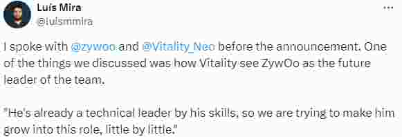 Luís Mira:“我与ZywOo还有Vitality俱乐部老板Neo进行过交谈,其中一个话题是Vitality如何将ZywOo视为团队未来的领导者。”