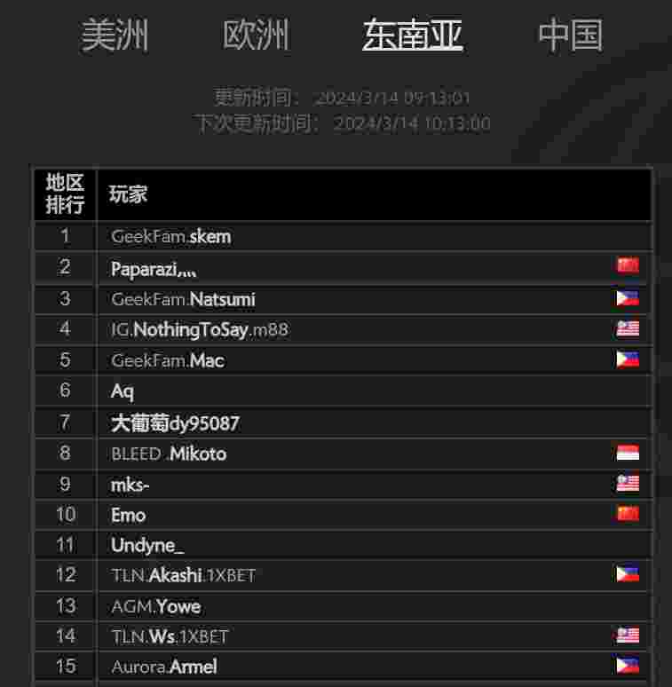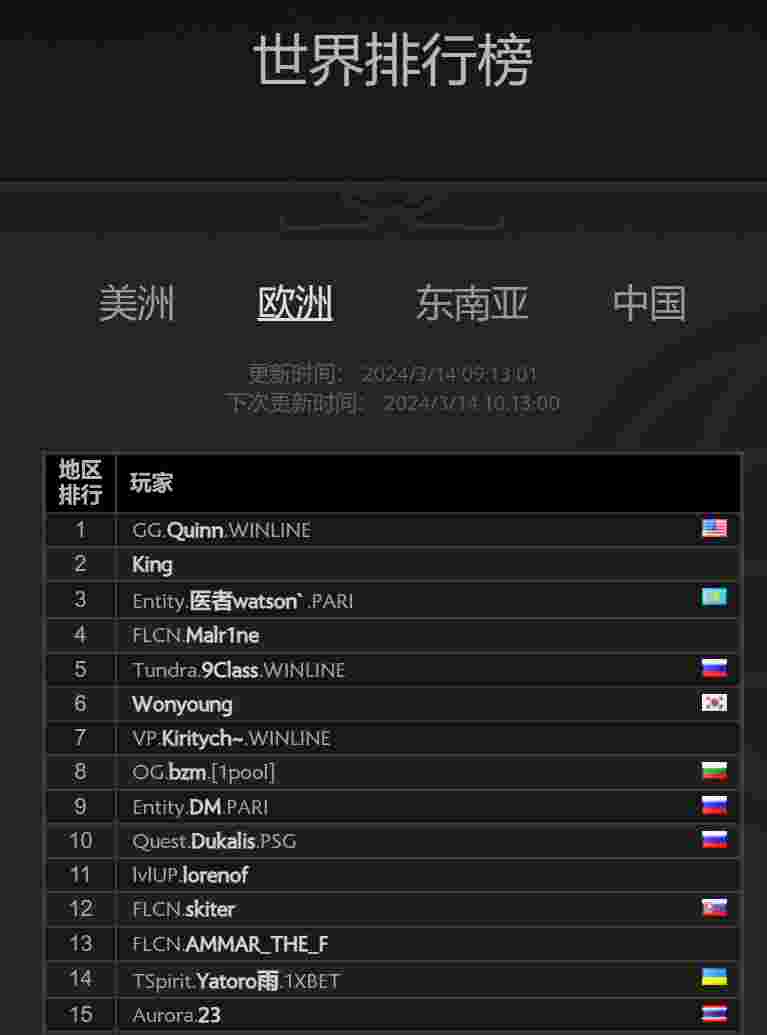 另外,Quinn 最近超越了东欧天才少年 Satanic,重返欧服天梯榜首。以下是欧服与东南亚服天梯排名前15名选手的概览: