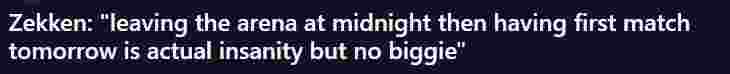 刚拿下EMEA区冠军KC的最大功臣无疑要给Zekken算一分,而这位平时并不怎么蹦跶的选手也有些受不住大师赛的赛程安排了,Zekken偷偷发推表示:比赛打到大半夜才走,明天第一场就还是我们的,真是疯了..(但没什么好抱怨的)。